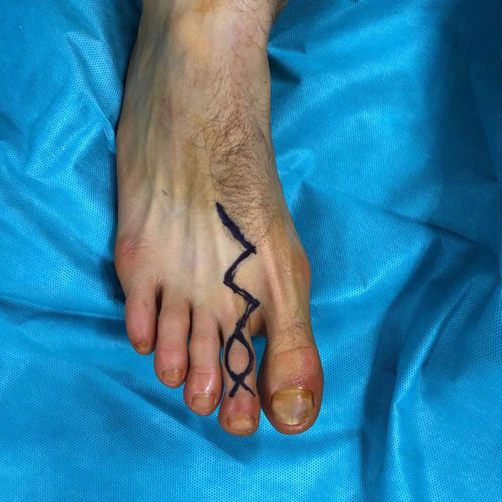Dessin du lambeau de transfert articulaire pour reconstruction de l’articulation inter-phalangienne proximale du 5ème doigt droit